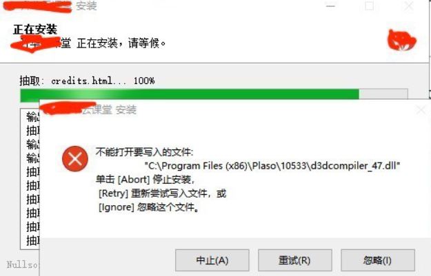 该问题是有文件正在被读写,再次安装无法写入。解决办法: 关闭安装程序和已经打开的客户端,重新安装。若不⾏重启电脑,重新下载安装即可。