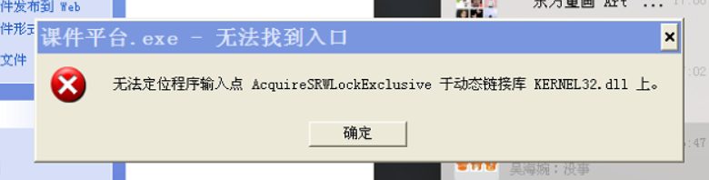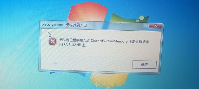 8)win7系统,打开客户端时提示“无法定位程序输入点 DiscardVirtualMemory 于动态链接库KERNEL32.dIl 上。”如下图