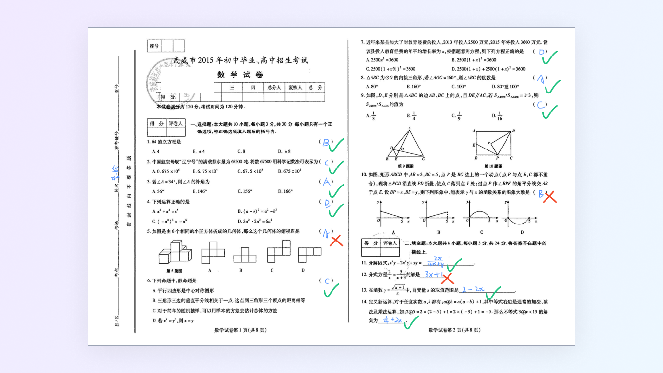 ✅ 可批改选择题、判断题、填空题、解答题、计算题(不等式/公式补全、单位换算、解方程、解方程组、公因数/倍数)、看图列式、表格、排序、复合题